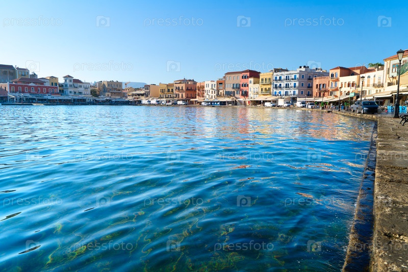 Венецианская гавань Хании с историческими домами в солнечный день, Крит, Греция