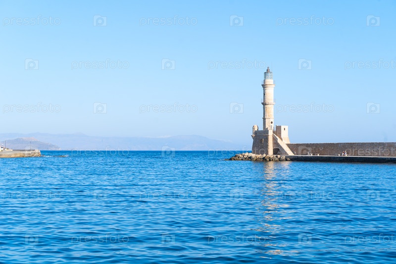 Залив Хания с морем и маяком на солнечном летнем закате, Крит, Греция, формат веб-баннера