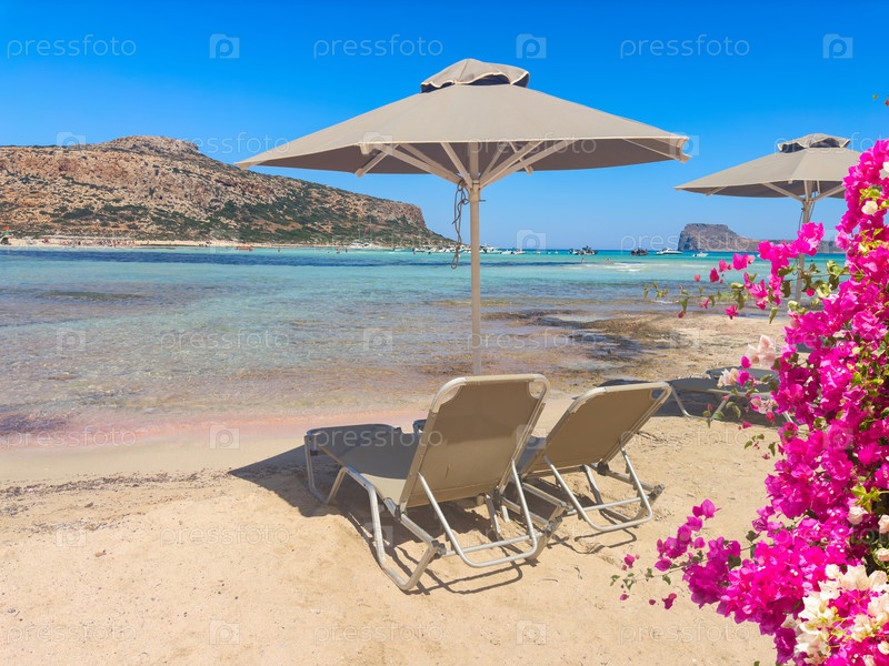 Солнечные лонжи пляжа Балос, Крит, Греция, тонизированные