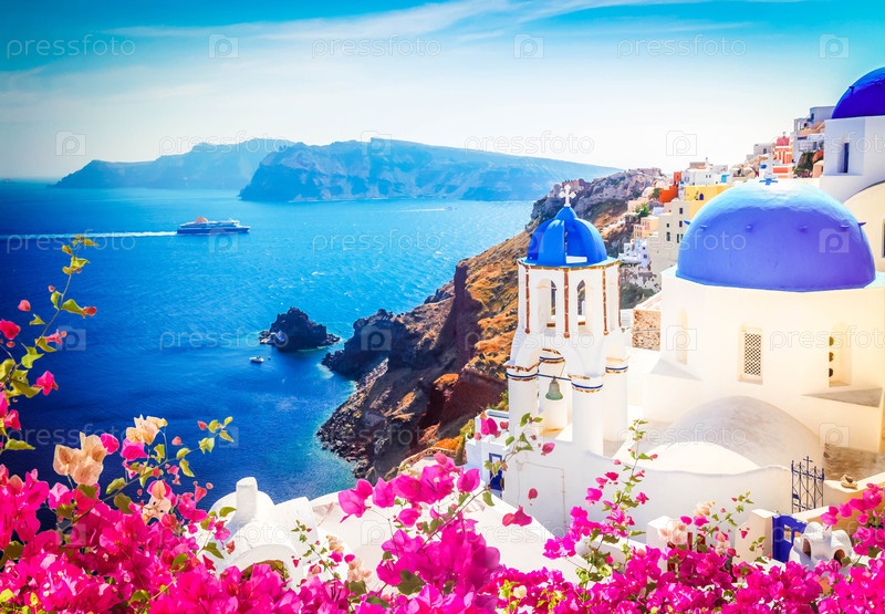 Кальдера вулкана с голубыми церковными куполами Оя с цветами, Санторини, оттененная