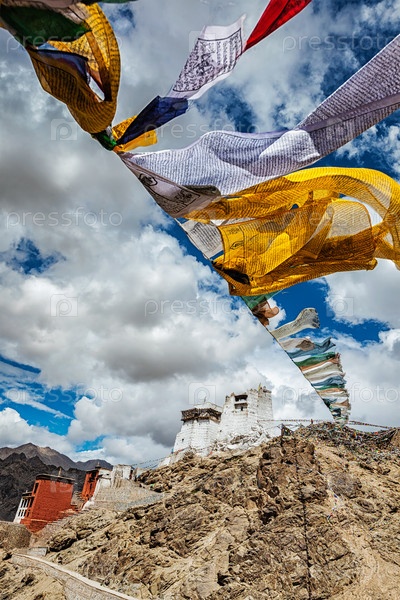 Помпа Леха и молитвенные флаги Люфты.Лех, Ладакх, Индия