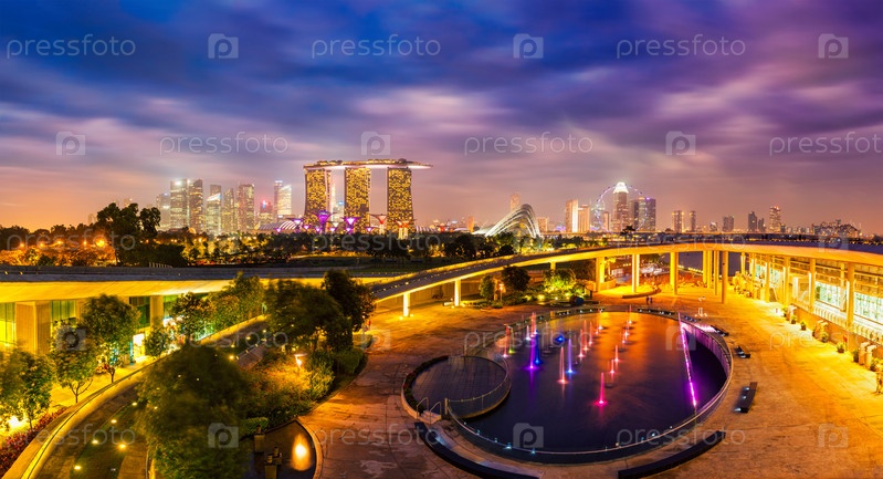 Концепция туристического туризма в Сингапуре - панорама горизонта Сингапура, освещенная вечерним сумерком