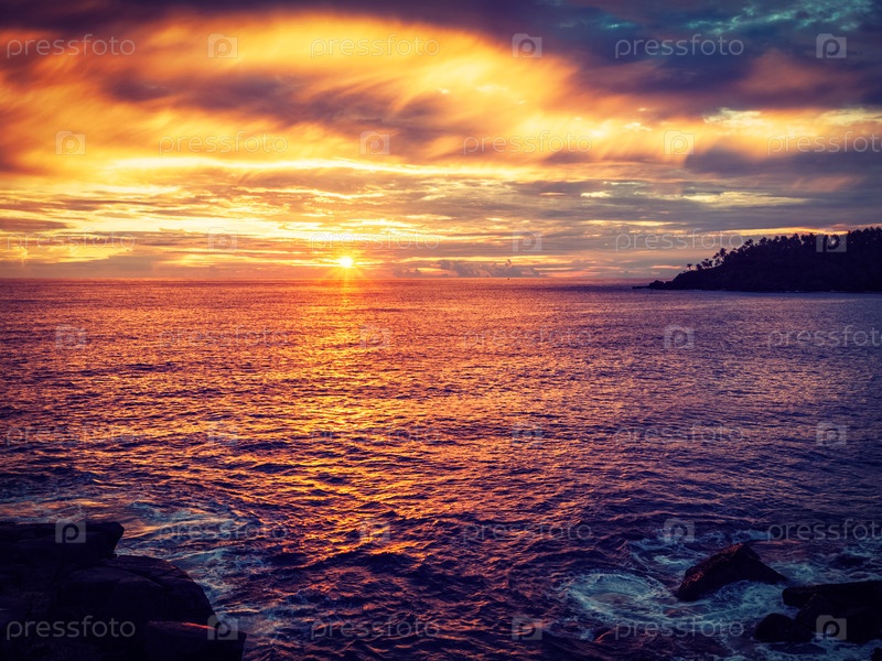 Винтажный ретро-эффект отфильтровал изображение в стиле хипстера романтического захода солнца на океане с драматическим небом