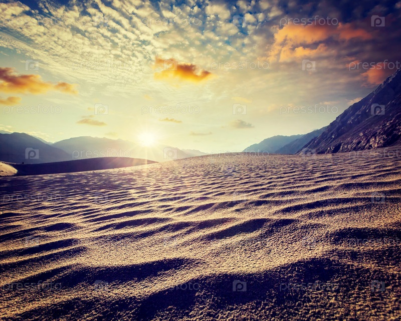 Винтажный ретро-эффект отфильтровал изображение песчаных дюн в Гималаях на восходе солнца