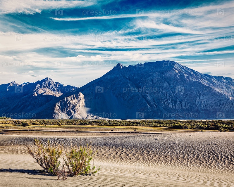 Винтажный ретро-эффект отфильтровал изображение песчаных дюн в долине Нубра в Гималаях