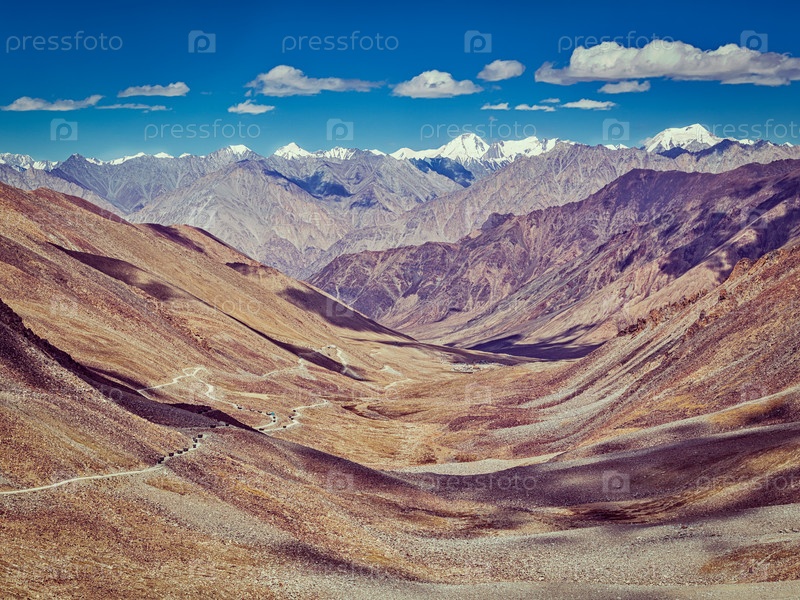Винтажный ретро-эффект отфильтровал хипстерский стиль хребта Каракорум и дорогу в долине из Кардунг Ла - самой высокой подъездной дороги в мире (5602 м)