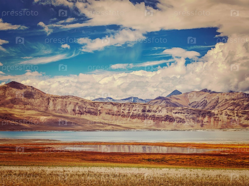 Винтажный ретро-эффект отфильтровал изображение хипстерского стиля Tso Kar - колеблющегося соленого озера mutane в Гималаях