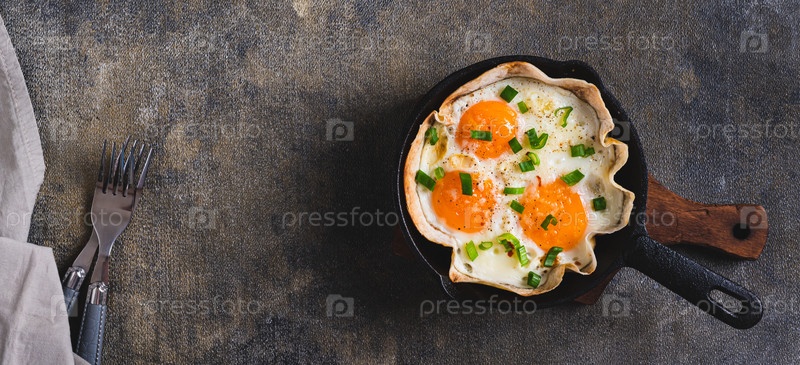 Жареные яйца с зеленым луком в тортильях, в сковороде на веб-баннере с видом на стол сверху