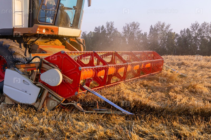 Комбинировать в вечернем свете, крупный план. Уборка ячменя. Летний урожай