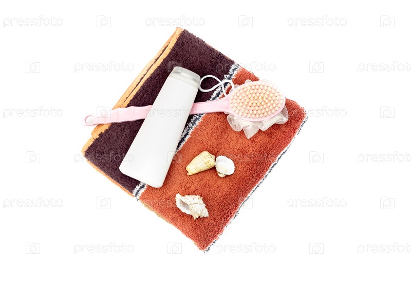 Два полотенца, шампунь и тряпка с ручкой на белом фоне