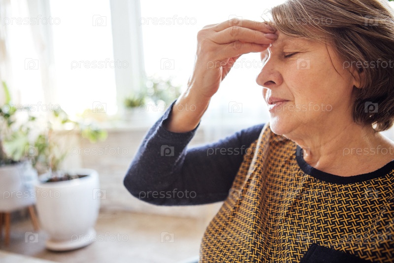 Закрытие пожилой женщины, страдающей от головной боли.Зрелая женщина закрыла глаза