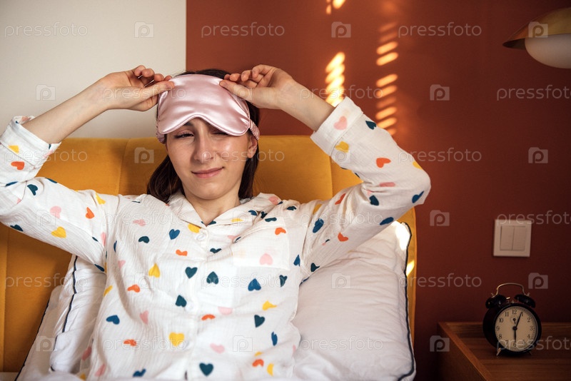 Молодая женщина в симпатичной пижаме и снотворной маске сидит на своей кровати, улыбаясь