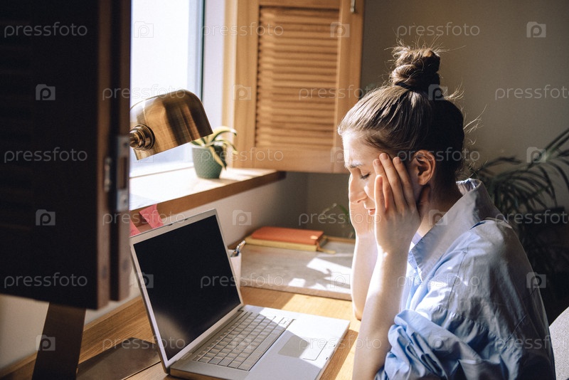 Усталая молодая женщина закрыла глаза и села перед компьютером.Фрилансер взяла перерыв с работы из-за головной боли