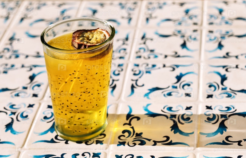 Заканчивая бокал свежего здорового напитка с страстными фруктами. сладкий сок из семян чиа
