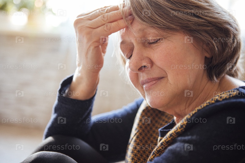 Закрытие пожилой женщины, страдающей от головной боли.Зрелая женщина закрыла глаза