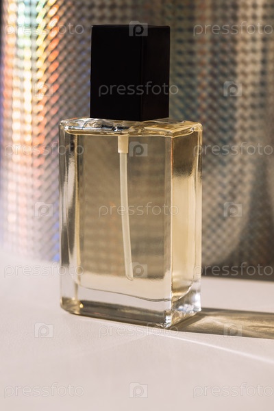 Близкий план элегантной прозрачной стеклянной бутылки с парфюмерией с черным крышкой на блестящем фоне