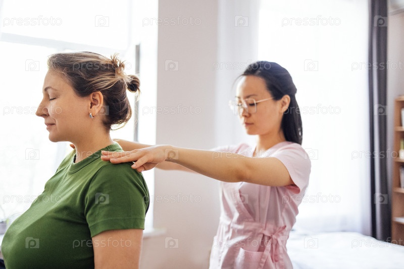 Массировщица в розовом наряде оказывает массаж плеч женщине в зеленой рубашке, создавая расслабляющую атмосферу в хорошо освещенной терапевтической комнате с мягкой мебелью