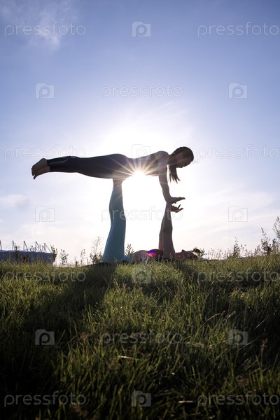 Силуэт женщины, выполняющей акробатическую позу в солнечный день, поддерживаемый другим человеком, окруженный пышной зеленой травой и прозрачным голубым небом, показывающим равновесие и силу