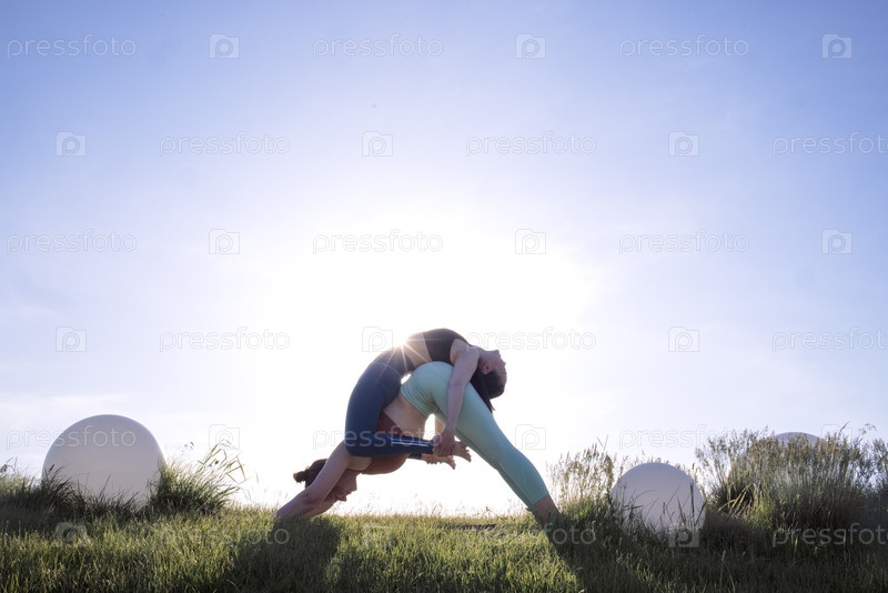 Два атлетических мужчины, выполняющие динамическую позу йоги на открытом воздухе, окруженные зеленой травой и абстрактными белыми сферами, демонстрируют гибкость и равновесие в спокойной обстановке