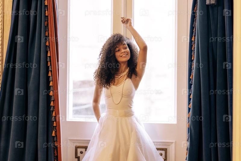 Очаровательная африканская женщина в элегантном белом платье стоит рядом с украшенными ретро-дверями