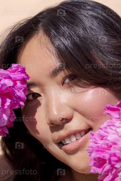 Азиатская женщина с длинными темными волосами мягко улыбается в окружении ярко-розовых цветов, демонстрируя естественную красоту и спокойную атмосферу в оживленной атмосфере на открытом воздухе