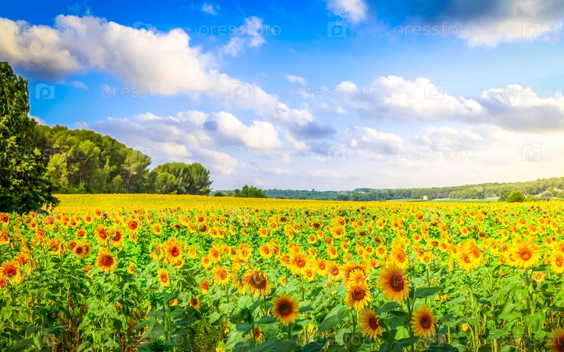 Поле подсолнечника в яркий летний день с голубым небом, Прованс, веб-баннер