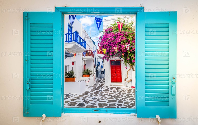 Типичная уютная белая улица острова Миконос, Греция, вид через окно