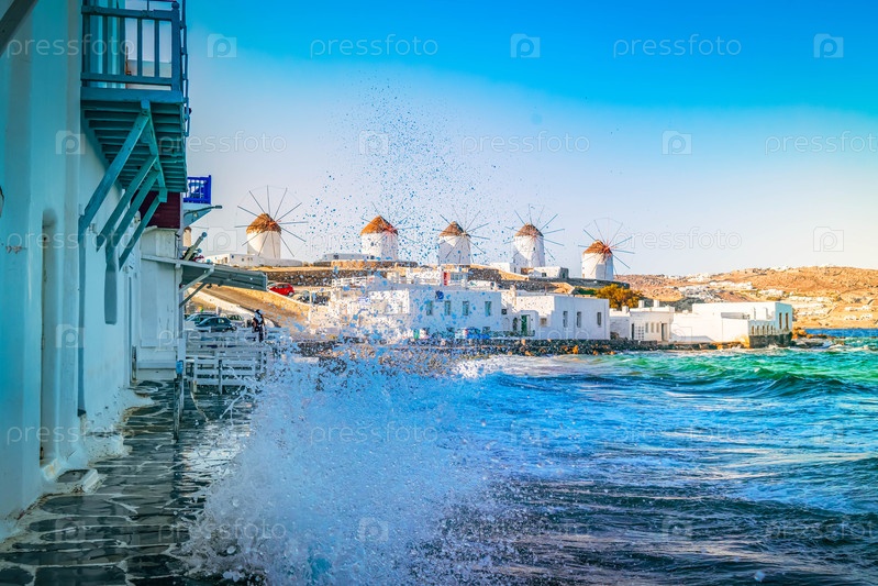 Знаменитые ветряные мельницы острова Миконос над морским пейзажем, Остров Миконос, Греция