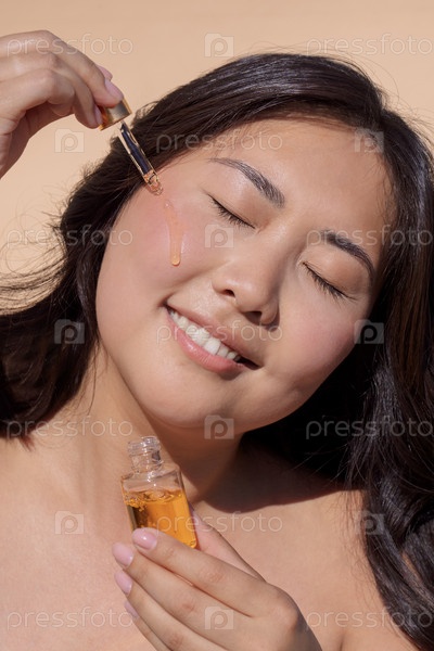 Азиатская женщина наносит масло для лица капельным способом, наслаждаясь рутиной ухода за кожей, показывая здоровую кожу и естественную красоту с мягким освещением и спокойной атмосферой