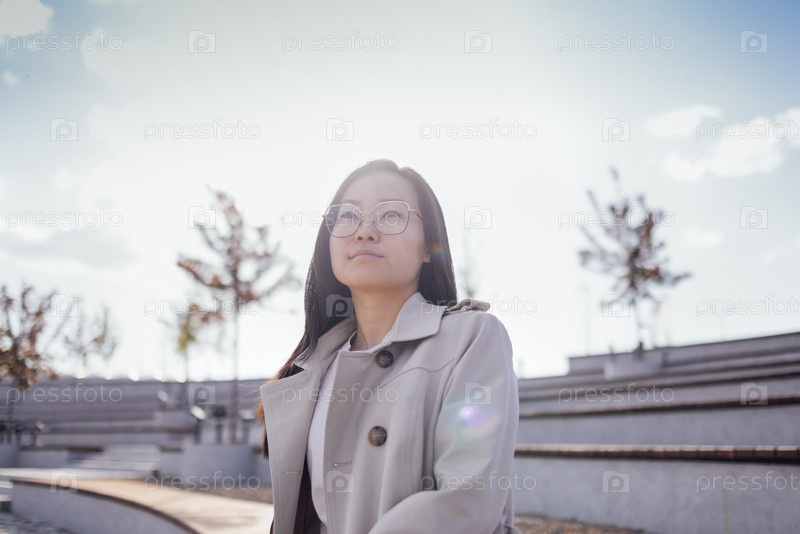 Молодая азиатская женщина стоит снаружи в светлом пальто и уверенно смотрит вперед.Привлекательная корейка с очками идет по улице города
