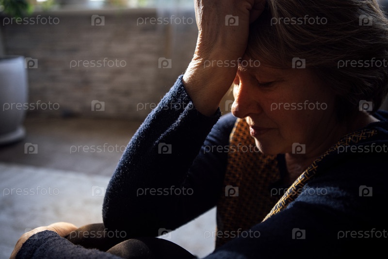 Закрытие пожилой женщины, страдающей от головной боли.Зрелая женщина сидит на полу