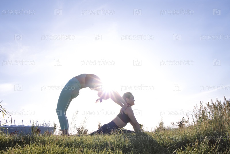 Две женщины практикуют йогу на открытом воздухе, одна в спине и другая в позе кобры, окруженные зеленой травой и ярким солнечным светом, демонстрируя гибкость и гармонию