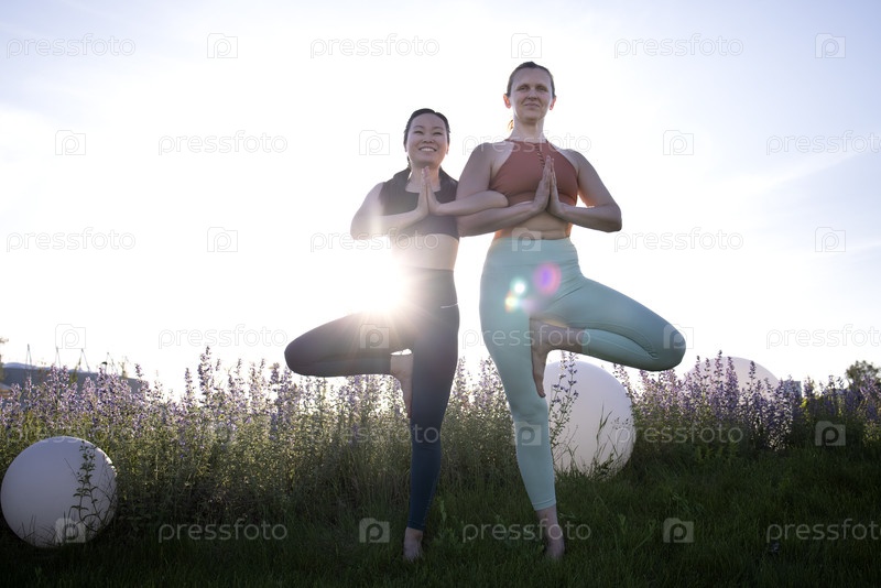 Две женщины практикуют йогу на открытом воздухе в поле лаванды, выполняя позу дерева с руками в молитвенном положении, окруженные мягким солнечным светом и спокойной атмосферой
