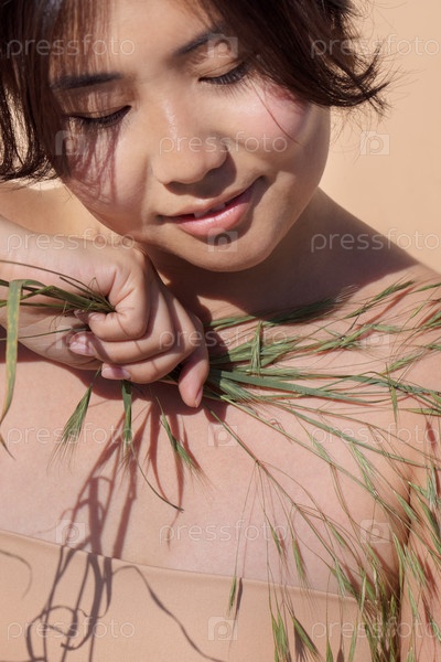 Азиатская женщина, нежно держащая зеленую траву на плече, с спокойным выражением лица, показывающим естественную красоту и связь с природой в мягкой, теплой, светлой среде