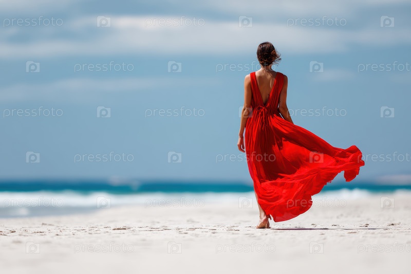 Спокойная сцена показывает изящную женщину в белом красном платье, которая элегантно гуляет по берегу океана
