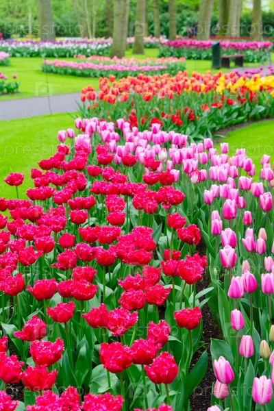 Красочно растущие красные, розовые, красные и фиолетовые тюльпаны цветут в весеннем официальном саду