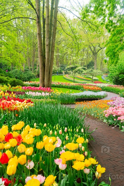 Путь через яркий сад тюльпанов в полном цветении во время восхитительного весеннего сезона захватывает дух