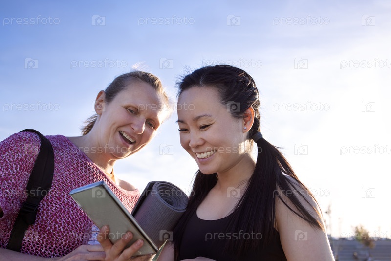 Две женщины ведут беседу на открытом воздухе, одна держит коврик для йоги, а другая проверяет цифровое устройство, демонстрируя момент связи и энтузиазма фитнеса