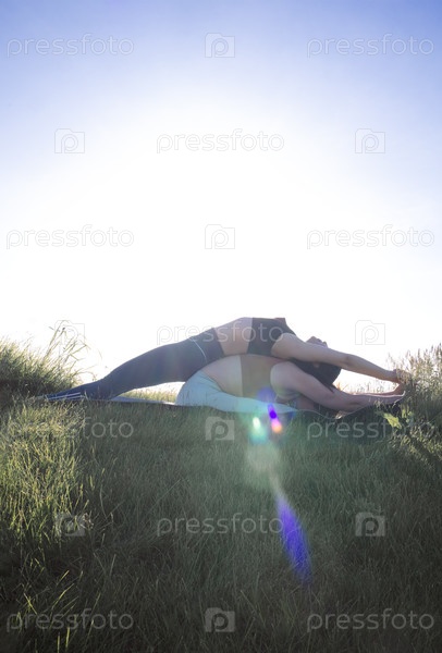 Две женщины практикуют йогу на травяном поле, выполняя сложную позу под ярким солнечным светом, демонстрируя гибкость и гармонию в спокойной среде природы