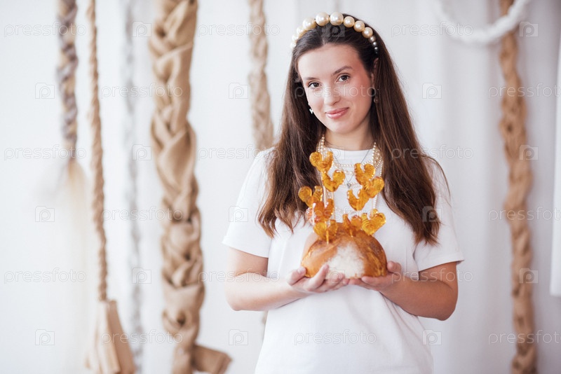 Молодая женщина в блузке держит хлеб, украшенный конфетами.Хорошо одетая девушка с жемчужной бусиной и головной повязкой со сладостями и сахарным петухом