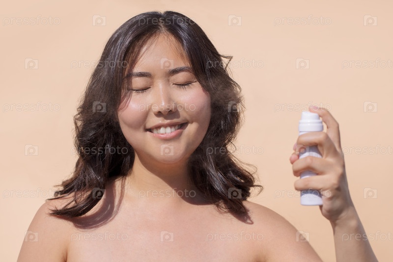 Молодая женщина с длинными темными волосами наносит спрей от тумана на лицо, наслаждаясь освежающей процедурой по уходу за кожей, при этом мягкий фон подчеркивает красоту и концепцию самообслуживания