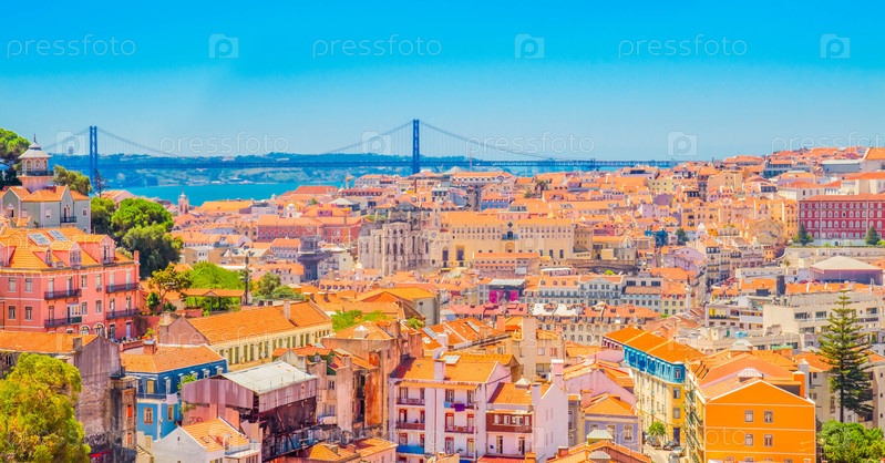 Лиссабонский горизонт над старым кварталом города с мостом 25 апреля, Португалия, панорама