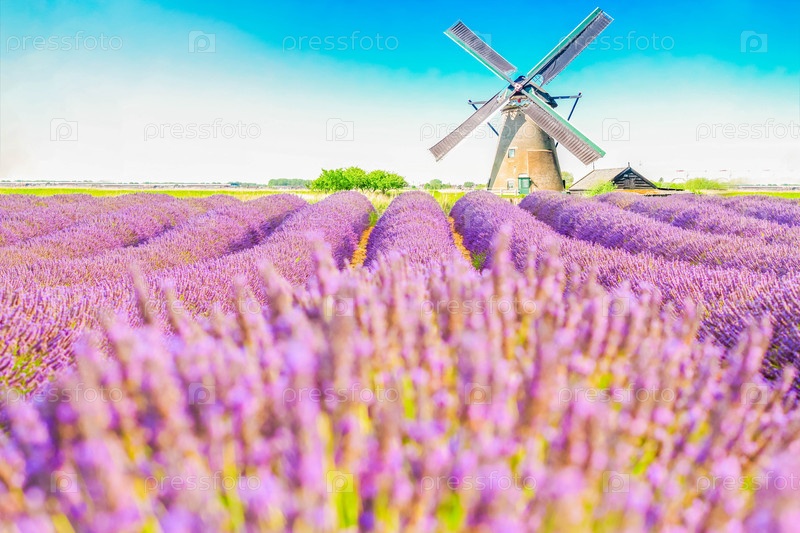 Лавандовый цветущий полевой холм с летним голубым небом, ветряная мельница на заднем плане, Франция