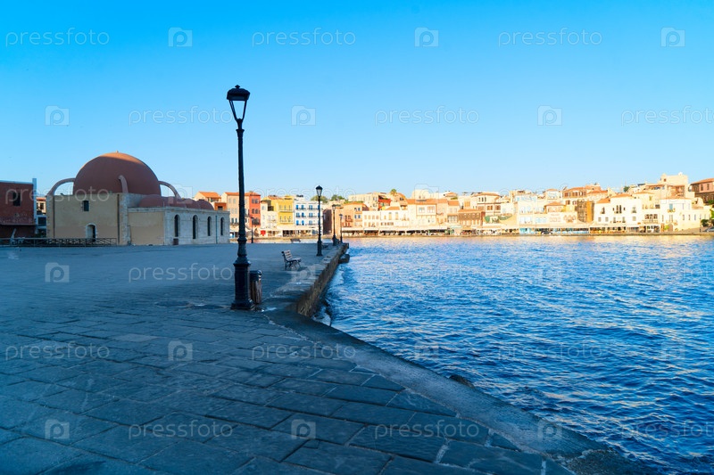 Венецианская гавань Хании с историческими домами в солнечный день, Крит, Греция