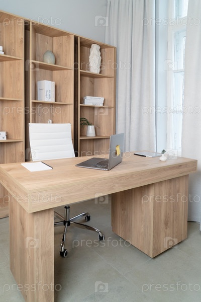 Современное офисное рабочее пространство с ноутбуком, минималистическим декором, комфортом и производительностью