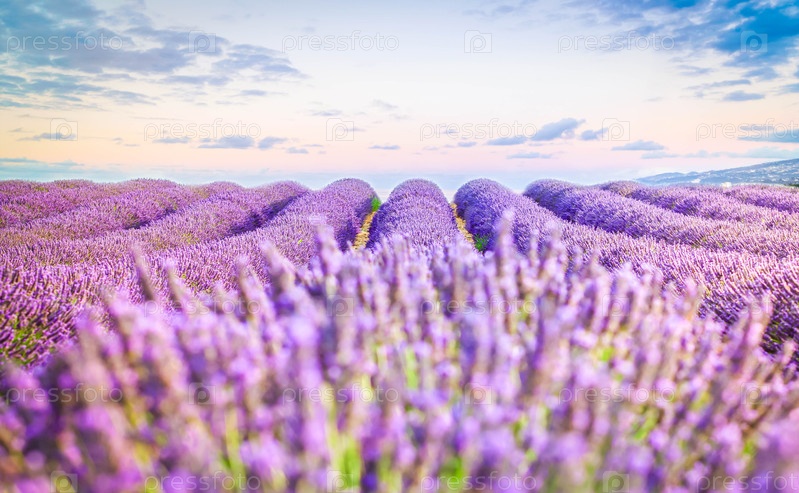 Поле свежих цветов лаванды с летним голубым и розовым восходом солнца, Прованс, Франция