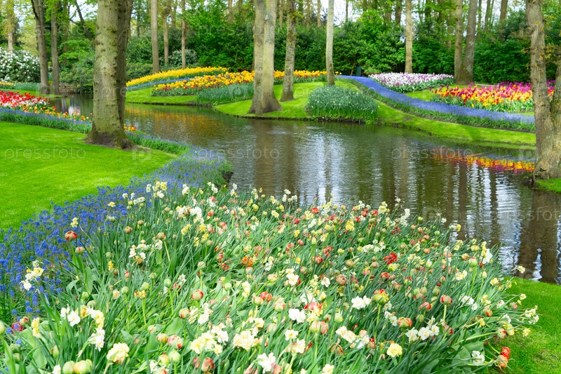 Красивая садовая сцена с красочными цветами и спокойными отражениями воды, идеально подходит для любителей природы