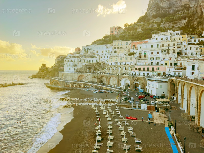 Летнее побережье Амальфи и Атрани на закате и Тирренское море со старым городом Atrani, Италия