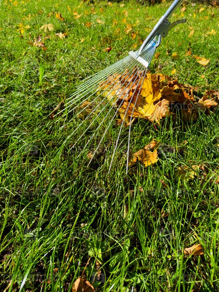 Выращивание ярко-желтых листьев на пышной зеленой лужайке в светлый и солнечный осенний день в парке