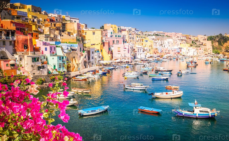 Остров Просида красочный город с гаванью летом с цветами, Италия